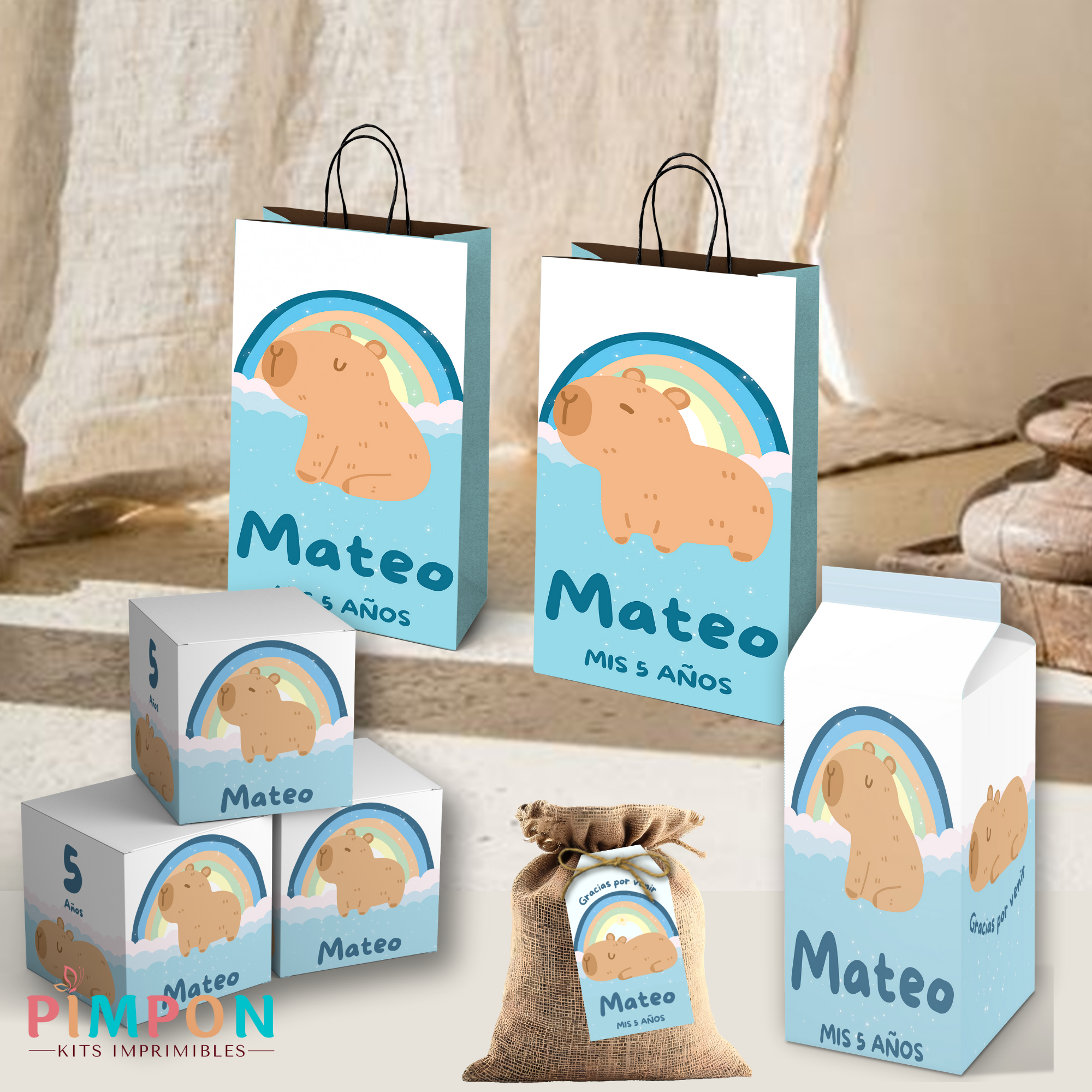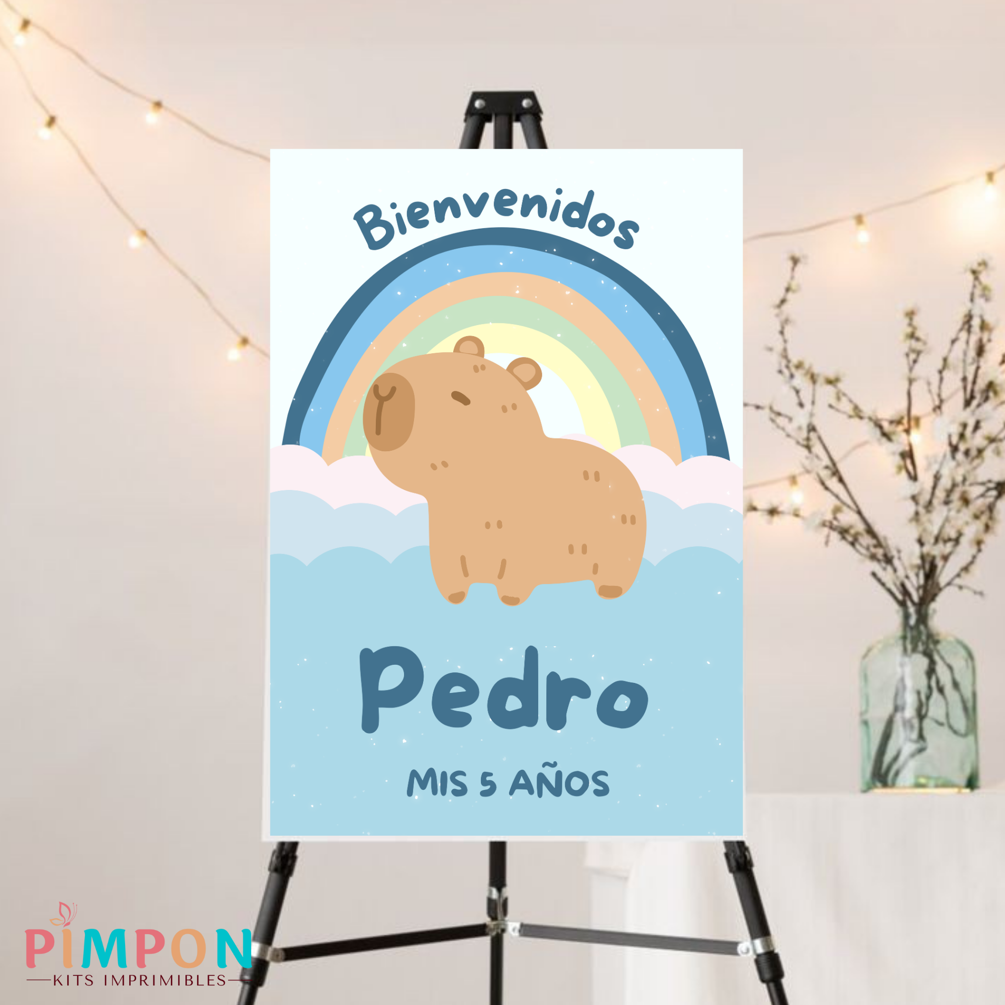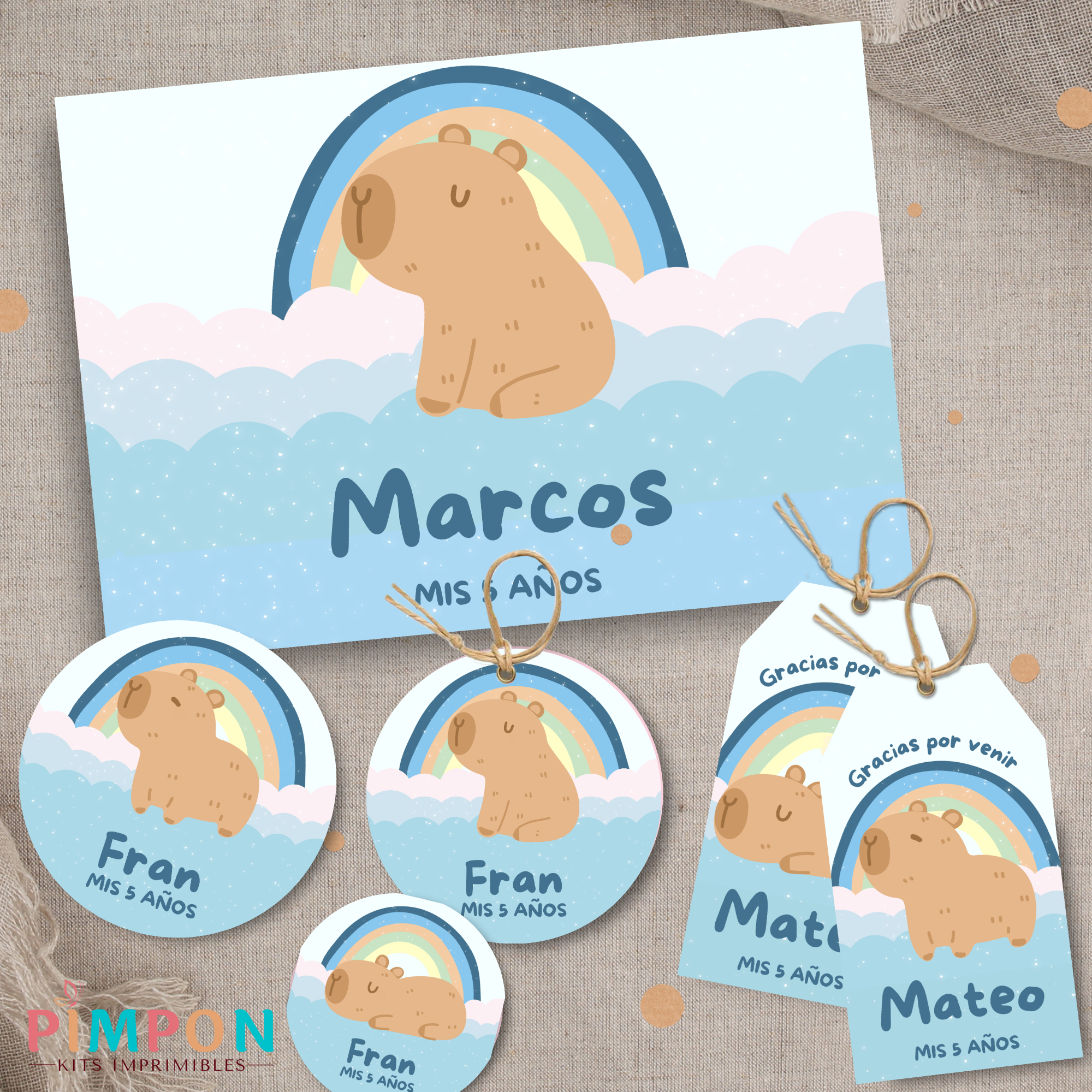 kit imprimible personalizado - CAPIBARA ARCOIRIS CELESTE