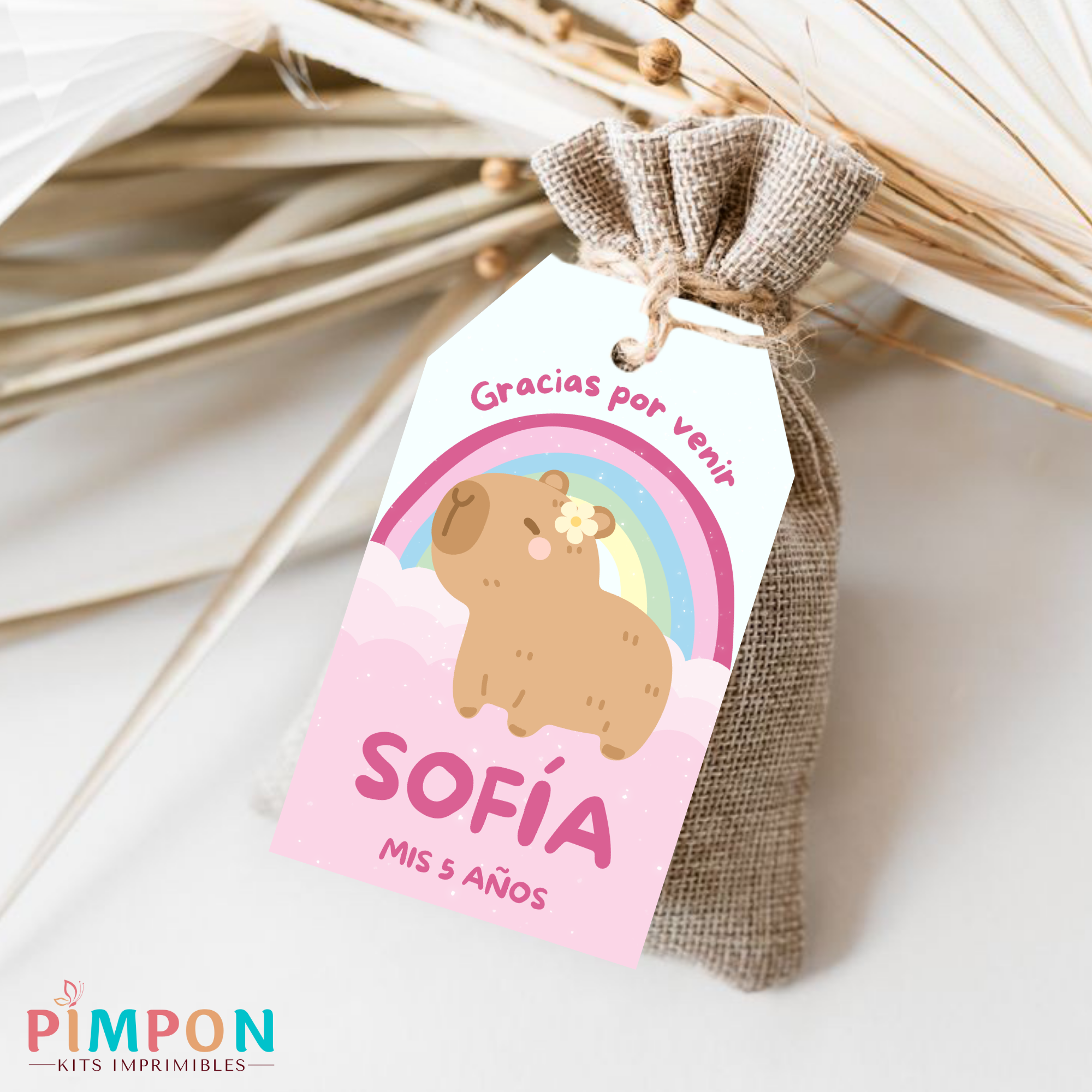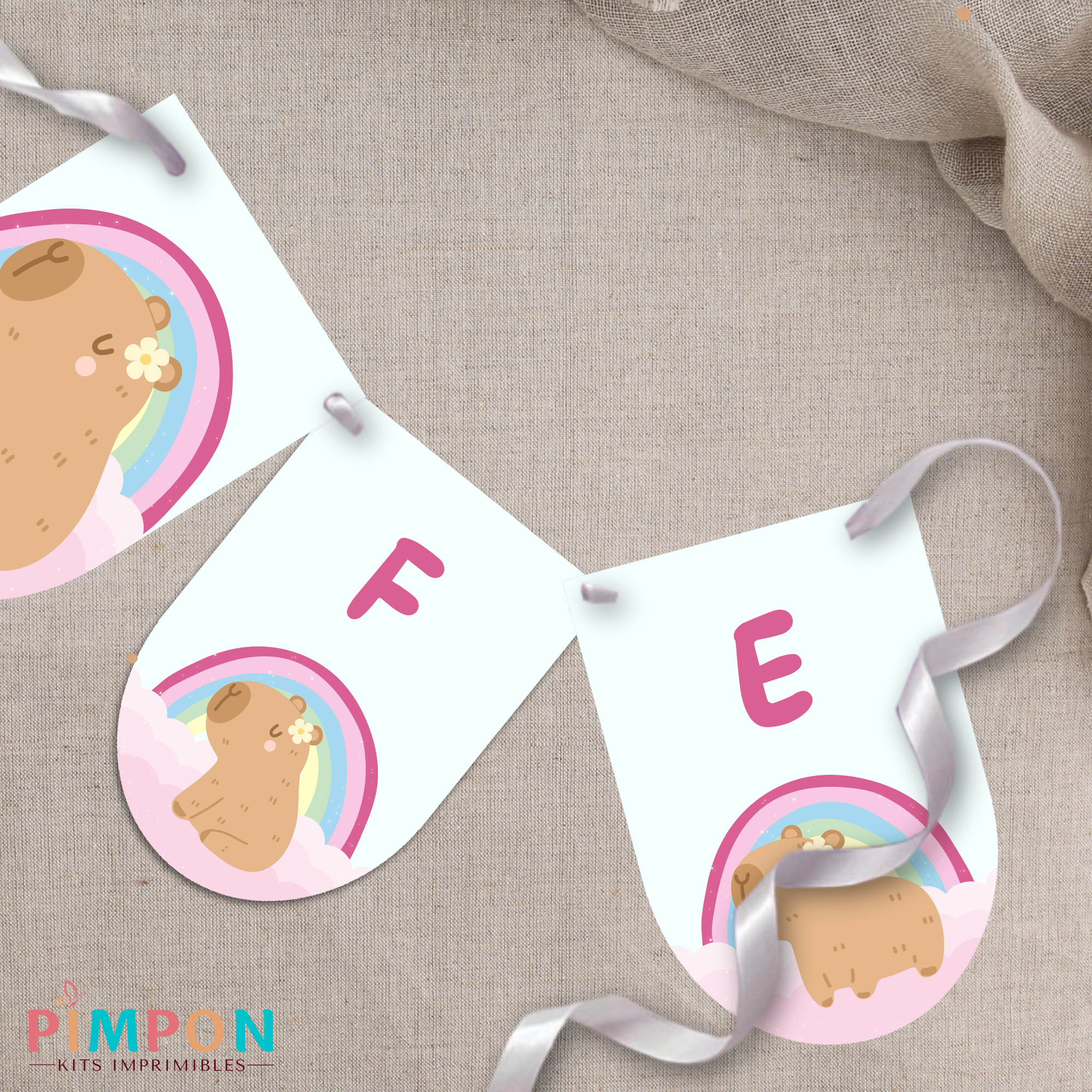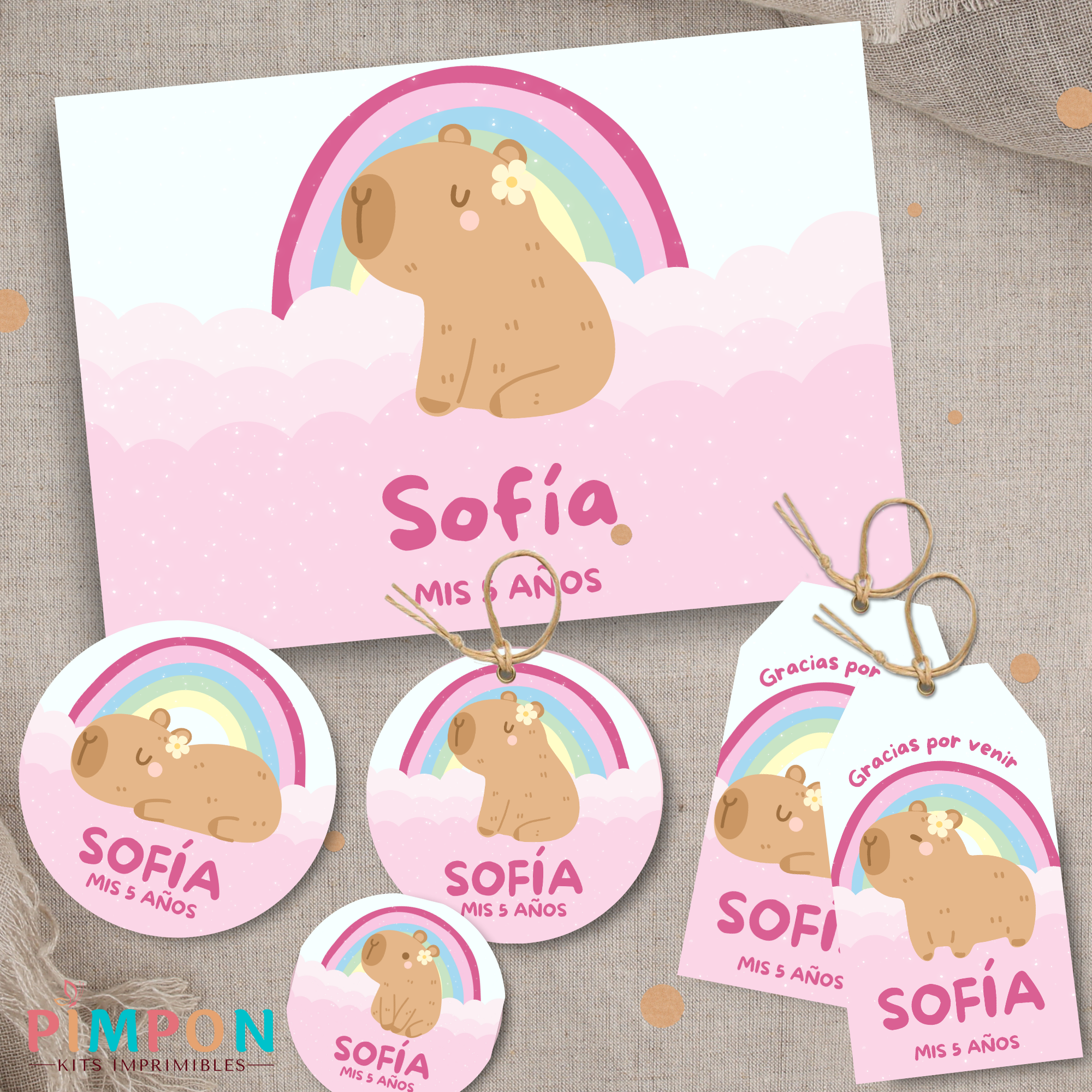 kit imprimible textos editables - CAPIBARA ARCOIRIS ROSA