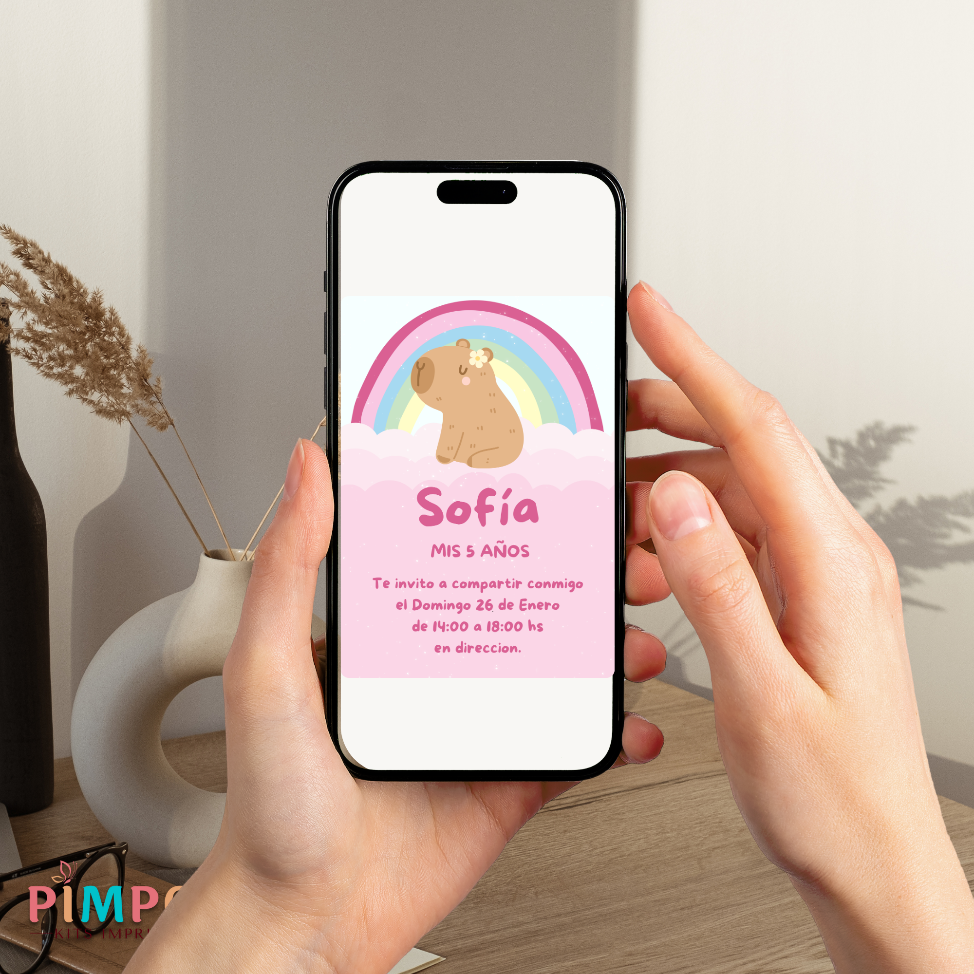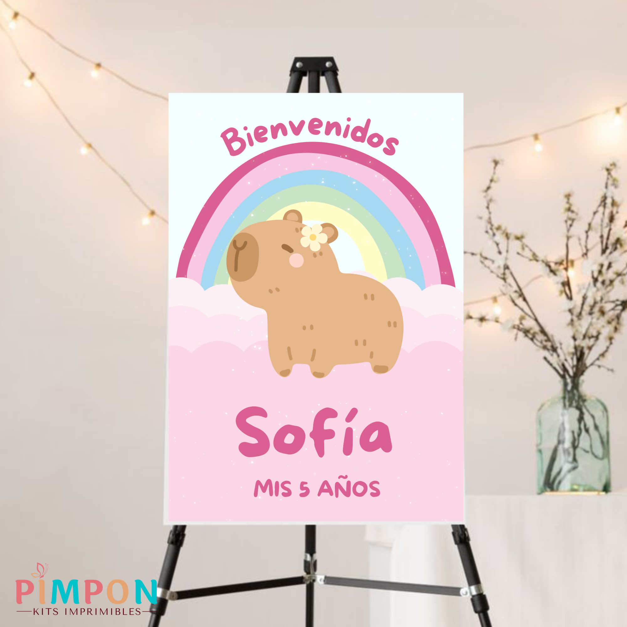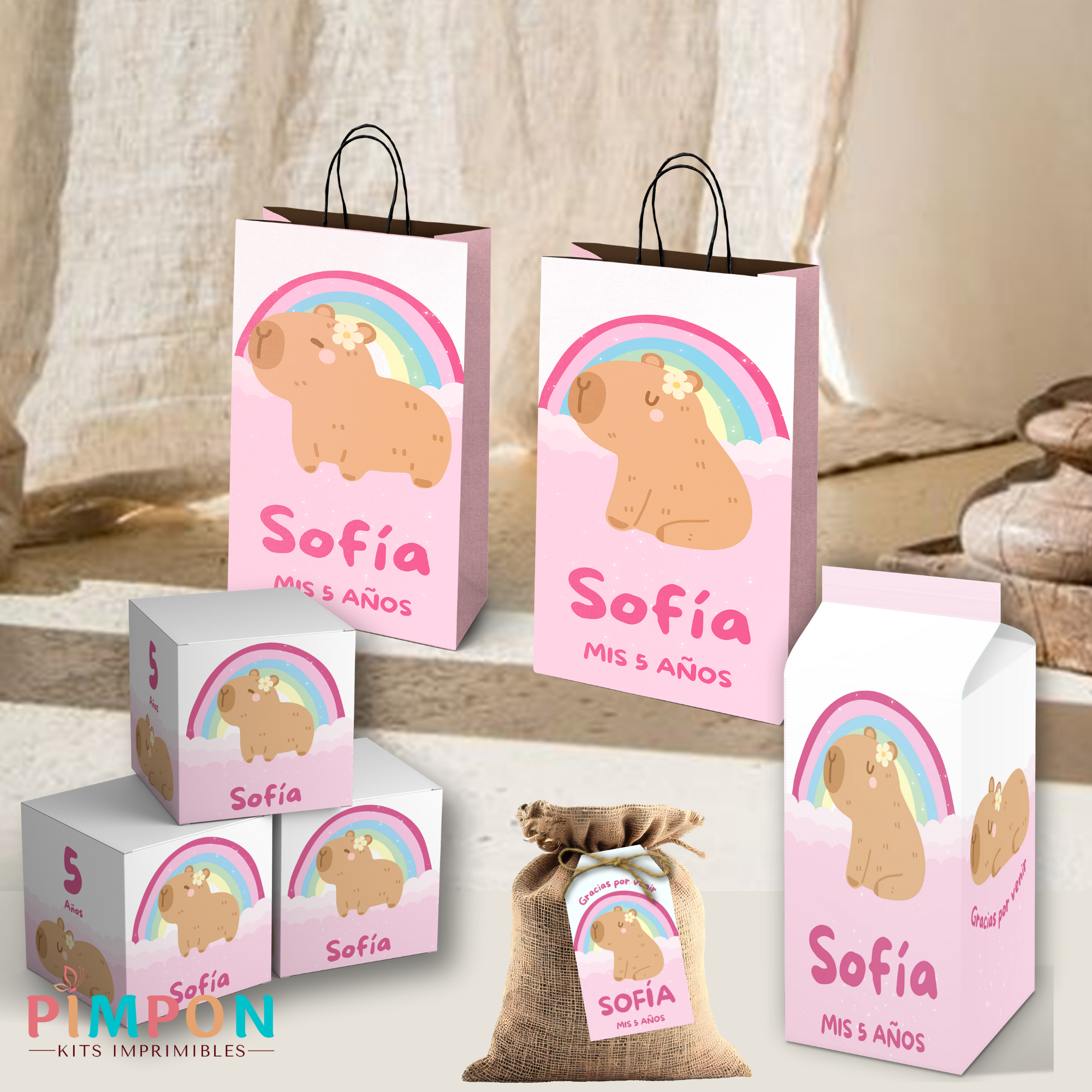 kit imprimible textos editables - CAPIBARA ARCOIRIS ROSA
